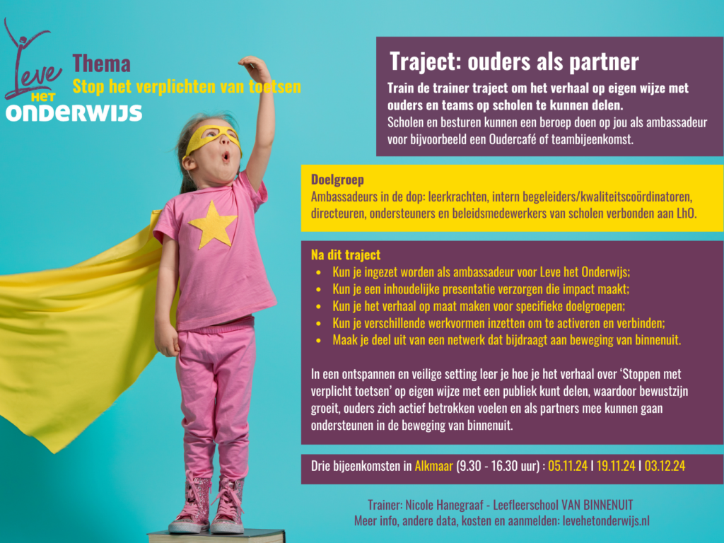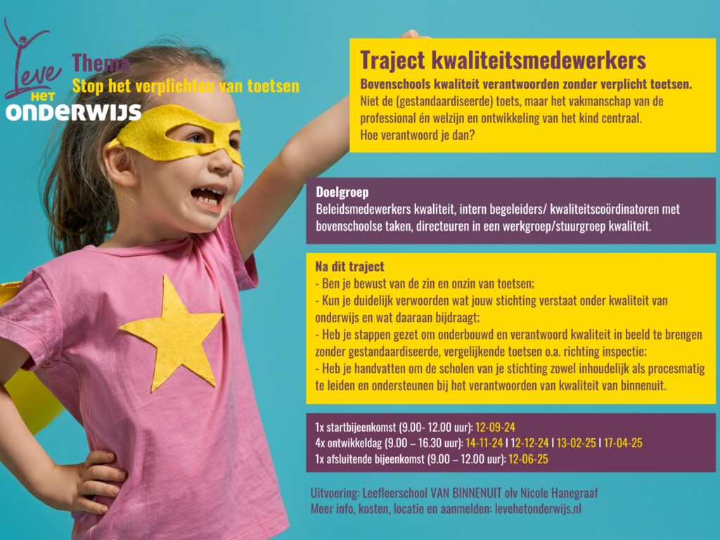 Dát is wat wij willen stoppen. We willen het onderwijs weer teruggeven aan het kind en de leraar. Dat betekent dat toetsen die worden afgenomen ten dienste van de oorspronkelijke bedoeling door ons worden ondersteund, maar dat wij niet langer verantwoordelijk willen zijn voor de prestatiedruk die aan kinderen en leraren jaarlijks meermaals wordt opgelegd. (Quote: “We zijn de eindtoetsscore gaan hanteren als genadeloze valbijl op twaalfjarige leeftijd.”)* We zijn ons bewust van het feit dat deze jarenlange verantwoordingsdruk op veel scholen ten koste is gegaan van de professionaliteit van leraren. We geven leraren waar (nog) nodig dan ook de ruimte en de tijd om zich deze professionaliteit weer toe te eigenen en zullen ze daarbij faciliteren en ondersteunen. (Quote: “Het zou mooi zijn als we inderdaad het vertrouwen in het onderwijs weer inhoud geven en op waarde schatten en kinderen niet alsmaar duwen in de mal van toetsen en afvinken.”)* Het manifest is dus géénszins een pleidooi om toetsen af te schaffen; het gaat ons om het verplicht afnemen van toetsen ten behoeve van het systeem, waar we individuele kinderen op het zelfde moment langs een algemene gemiddelde ‘meetlat leggen’, en de ongewenste druk die daardoor ontstaat bij leraren en kinderen.